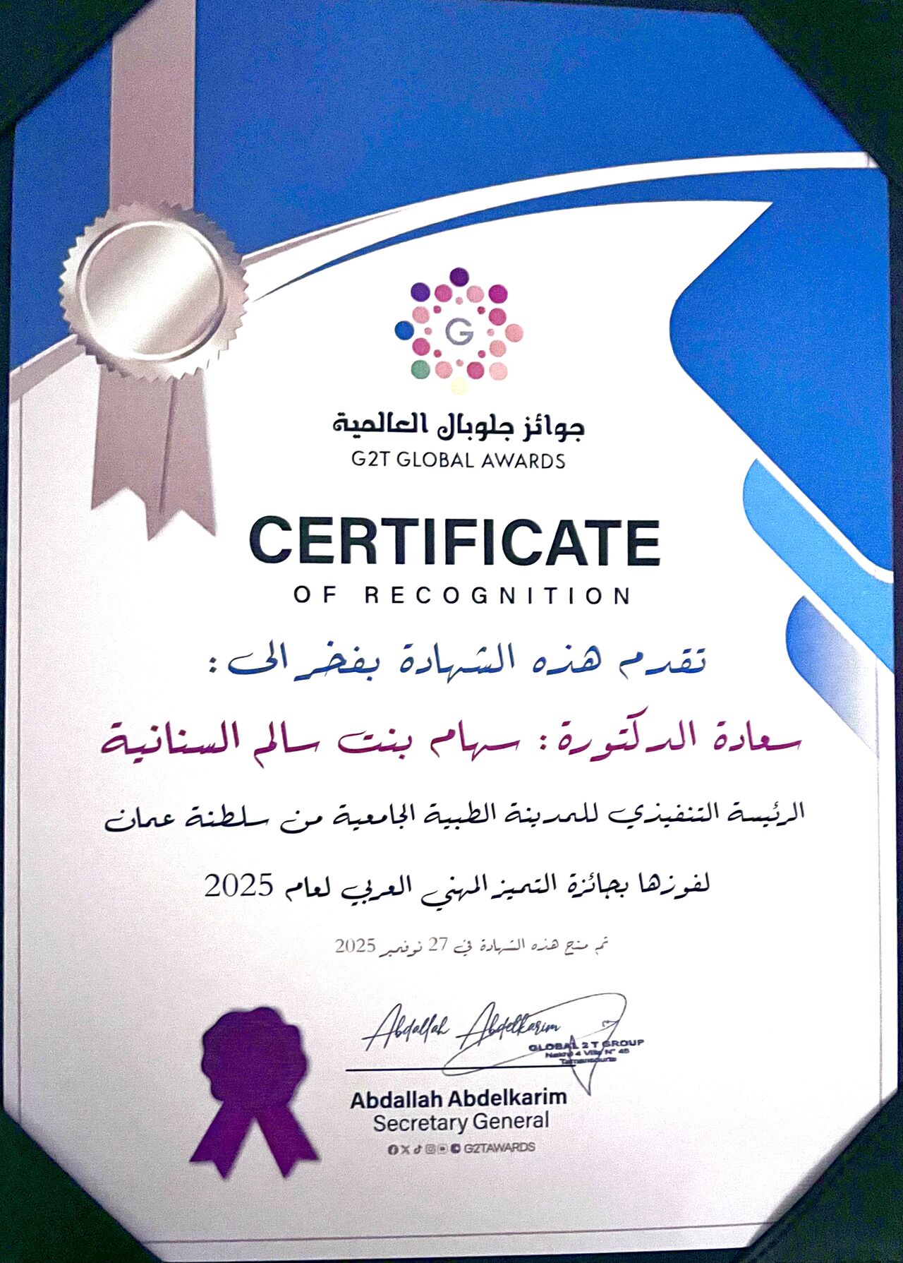 حققت الدكتورة سهام بنت سالم السنانية، الرئيسة التنفيذية للمدينة الطبية الجامعية، بسلطنة عمان، إنجازًا مهنيًا عربيًا وإقليميًا بحصولها على جائزة “التميز المهني العربي لعام 2025″، وباختيارها ضمن قائمة “أفضل مائة رئيس تنفيذي عربي لعام 2025″، وذلك في إطار فعاليات جوائز “جلوبال” العالمية في دورتها العاشرة، التي أقيمت في مدينة مراكش بالمملكة المغربية.